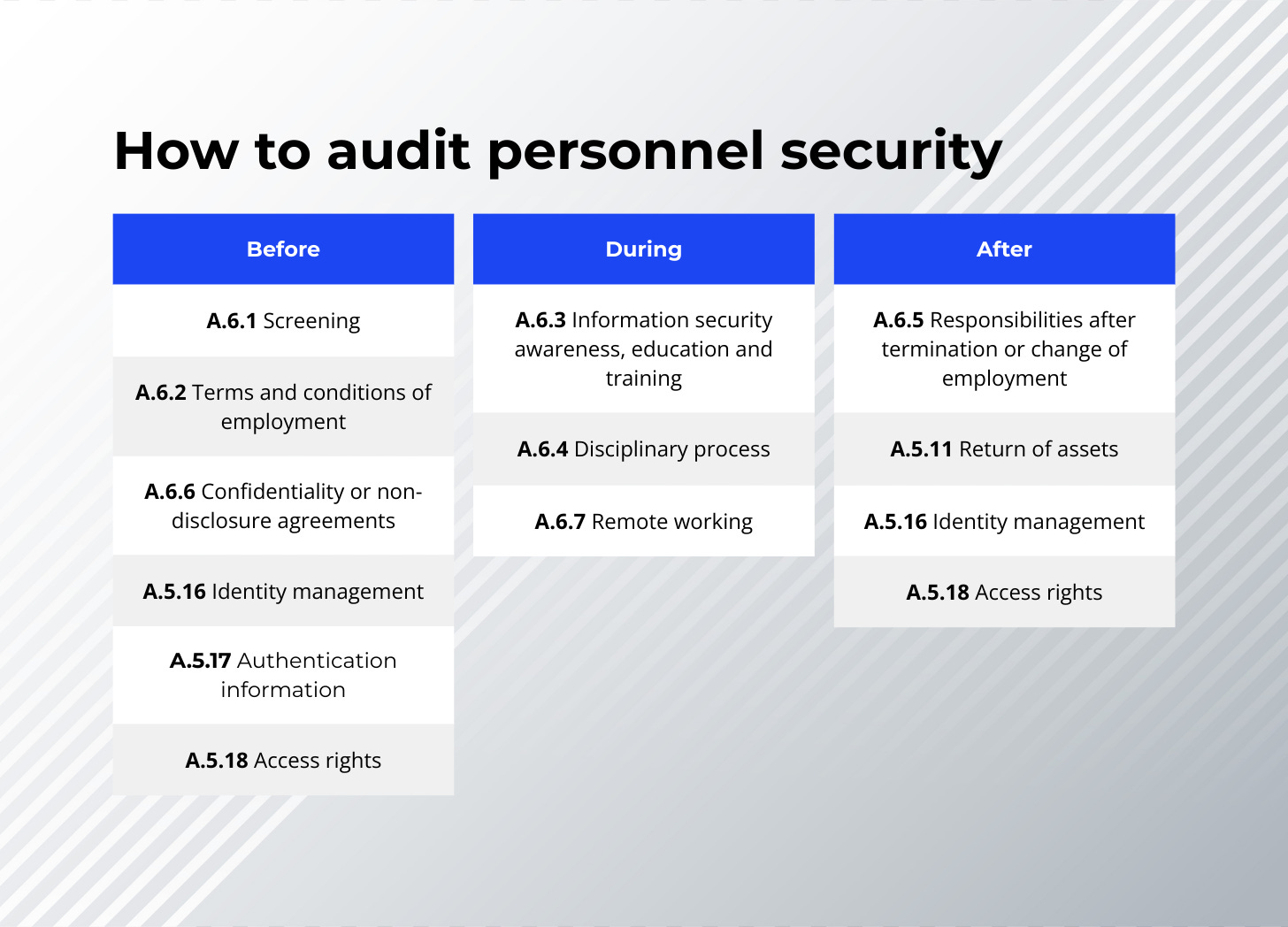 When you look at the ISO/IEC 27001 controls for personnel security, it’s easy to just go down the list. You start at the top and work your way to the bottom. Most auditors do exactly that.